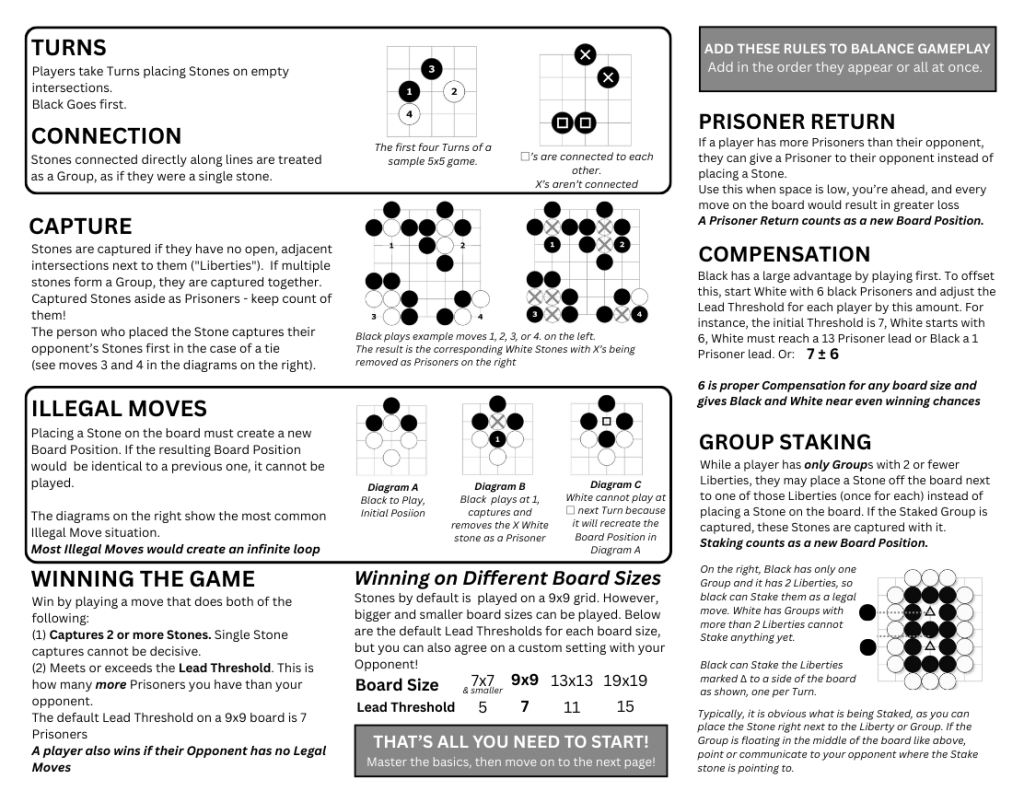 In 2025, Iowa Go Society developed ‘Stones’ as a variant of Go that can be taught, played, and retaught quickly and accurately without lessons, teachers, and troves of additional information to correctly end and determine the winner of the game. The end result is nearly identical, too! There are a few unique situations where Go and Stones can diverge, but for the vast majority of moves and games, the exact same strategies and moves will result in the same winner of both games.