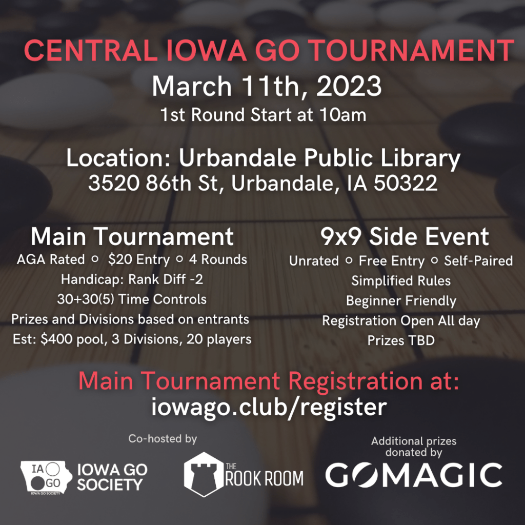 Self-pair 9×9 tournament for beginners (unranked). Registration and play is open until 3:30pm for this event, sign up at the event an play at your own pace. Prizes for top finishers, including Go Magic premium memberships.